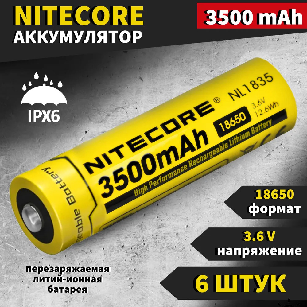 Аккумулятор Li-Ion NITECORE 18650 3500 mAh 3.6V (6 штук) / Перезаряжаемый литий-ионный элемент питания с пимпочкой (защищенный) / Аккумуляторная батарейка литиевая