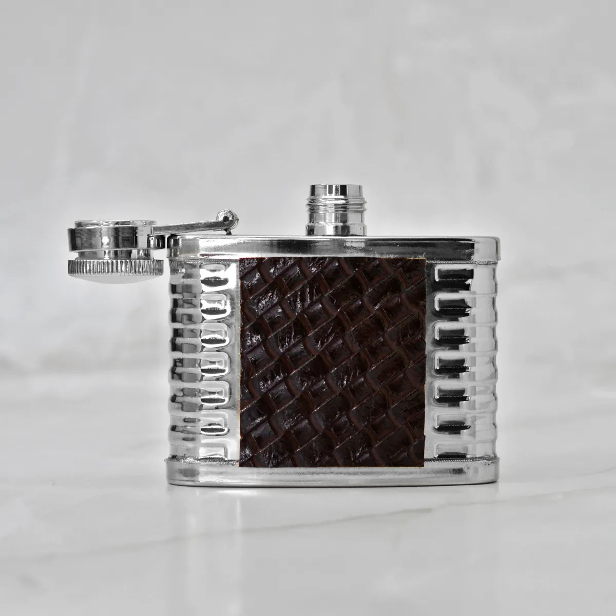 Фляга стальная плоская 2 oz (60мл.) со вставкой "плетенка" коричневый