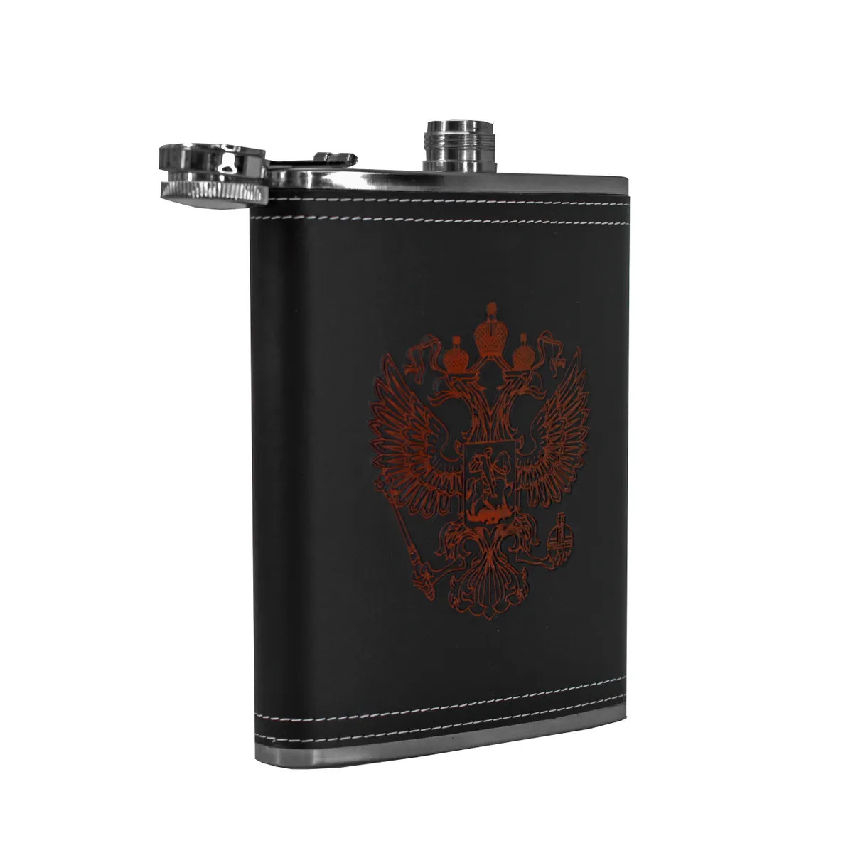 Фляжка с гербом Российской Федерации в чехле под кожу, на котором и высечено благородное изображение. Прочное, надёжное, долговечное и красивое изделие подойдёт для настоящих патриотов, любящих путешествовать по Родине, а также для мужчин, часто ходящих в походы со своими товарищами. Фляга имеет надёжную крышку с держателем, благодаря чему жидкость не никогда не выльется. Изделие из нержавеющей стали удобно сидит в руке, не выскальзывает и имеет объём 600 мл.