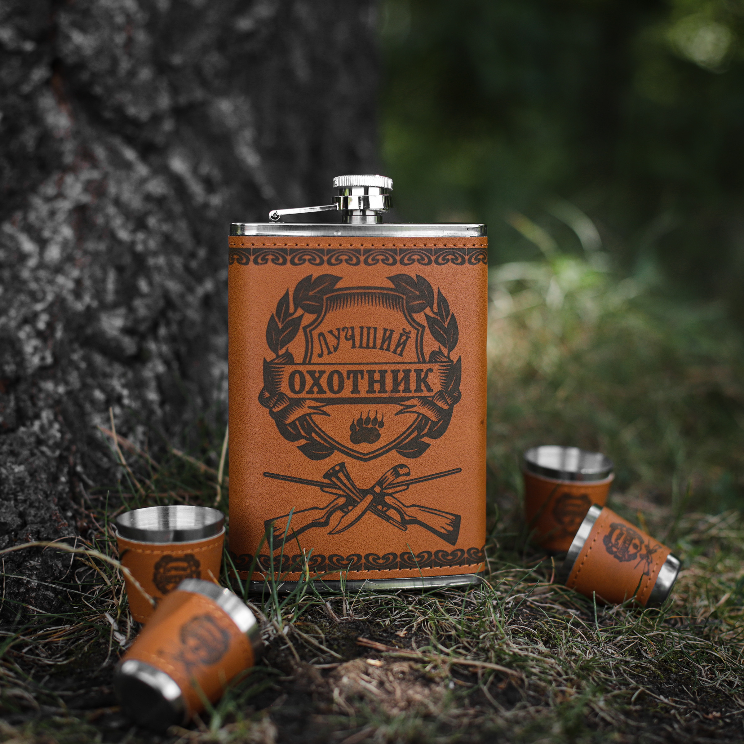 На лицевой стороне фляжки и 4-х стопок, нанесена символика "Лучший охотник". Набор красиво упакован в подарочную коробку.
