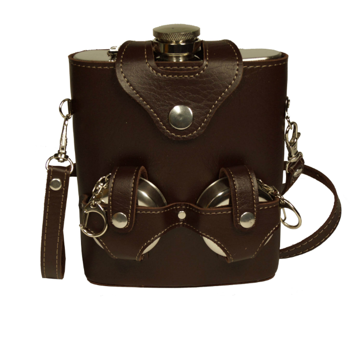 Фляжка в чехле со складными стаканами - очень удобный походный аксессуар, незаменимый в путешествии. Набор фляга со стопками состоит из фляжки, емкостью 500 мл, и 2-х стаканов по 60 мл каждый. Они произведены из безопасной пищевой нержавеющей стали, а чехол выполнен в искусственной коже. Это небольшой и функциональный комплект - фляга со стаканами очень компактно располагаются в чехле за счет возможности стаканов складываться, а ремешок, пришитый к чехлу, дарит дополнительные удобства ношения фляги.