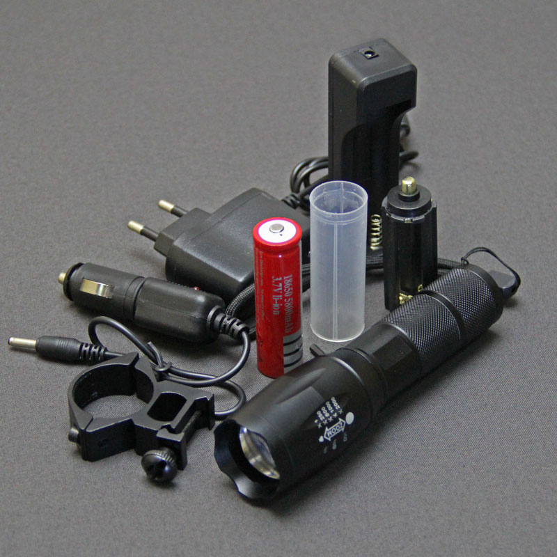 Диод Cree XML T6, Zoom, алюминий, зарядка от сети 220В, зарядка от бортовой сети автомобиля, крепление на оружие