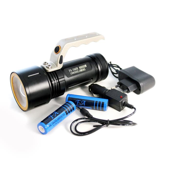 Аккумуляторный светодиодный фонарь Bailong FA-3409 8800W изготовлен из алюминиевого, ударопрочного сплава. Фонарь может работать непрерывно от двух аккумуляторов в течение 5 часов и подзаряжаться от прикуривателя автомобиля.