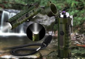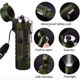 Импульсная водонепроницаемая USB зажигалка F16, двойная дуга + фонарь, камуфляж