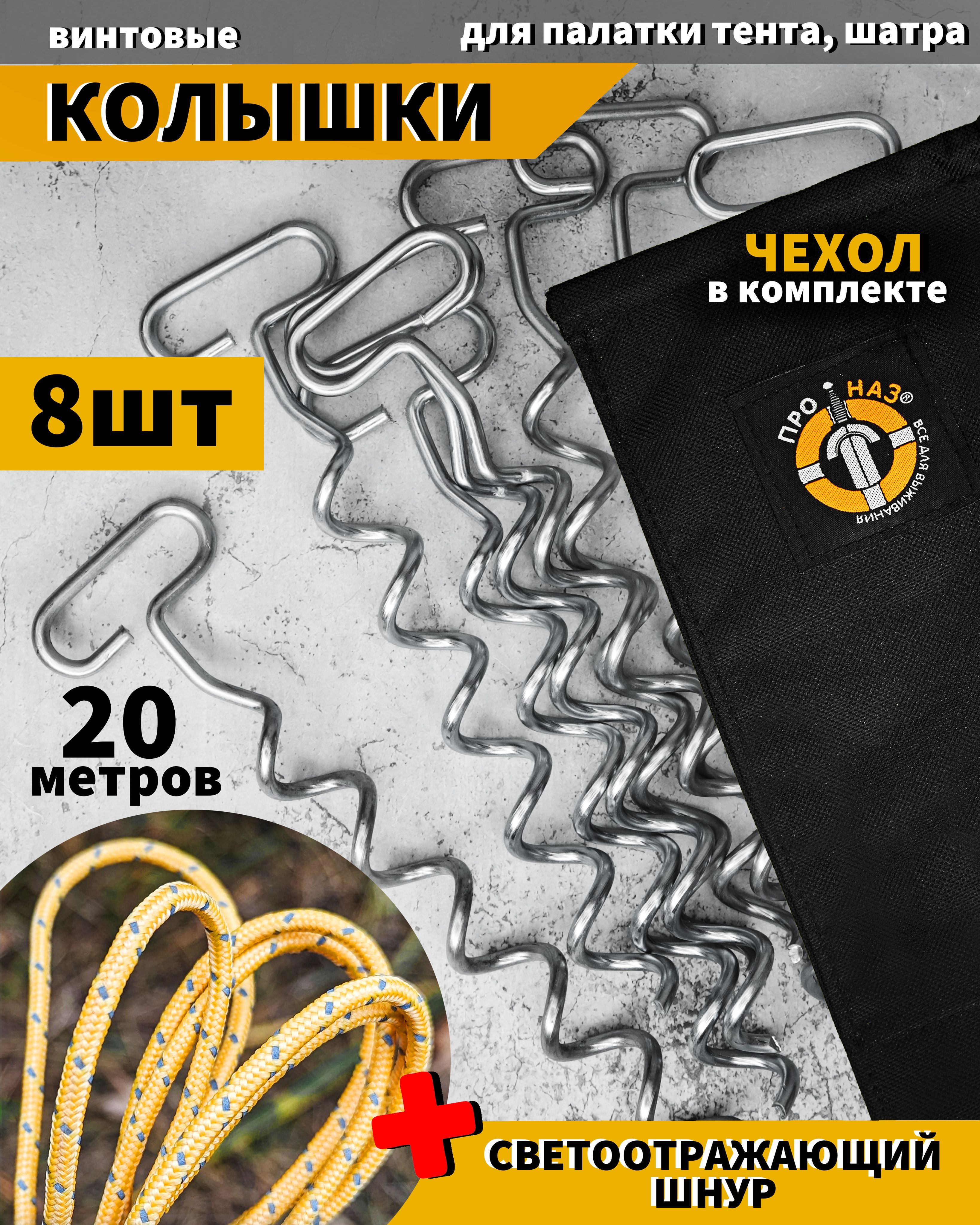 Колышки спиральные (винтовые) для палатки (снег, песок, экстрим) 8шт + чехол + светоотражающий шнур 20м