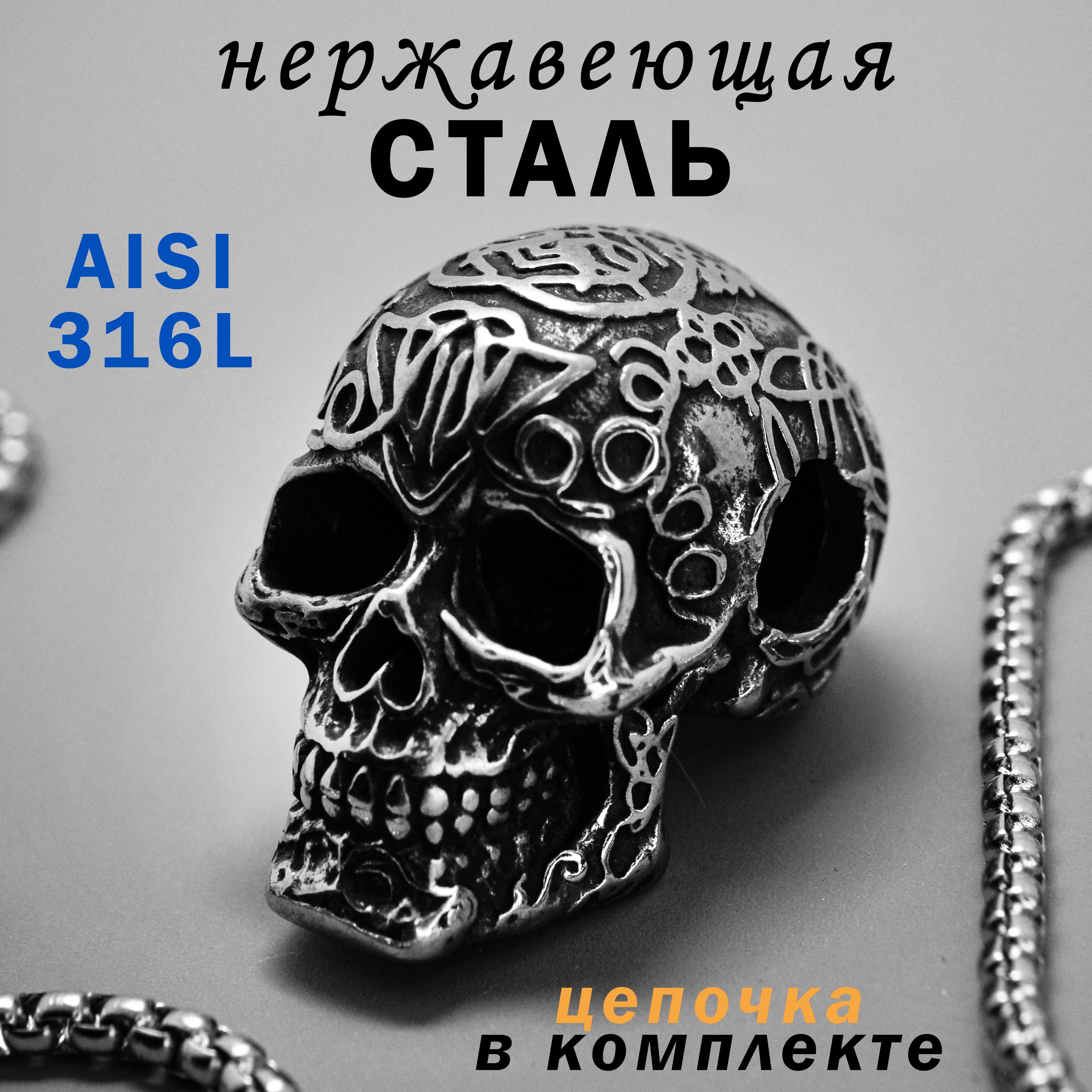 Комплект: массивная подвеска из нержавеющей стали A4 AISI 316L + цепочка 60см / Кулон "Череп" / Оберег скандинавский с рунами, триглав амулет, талисман