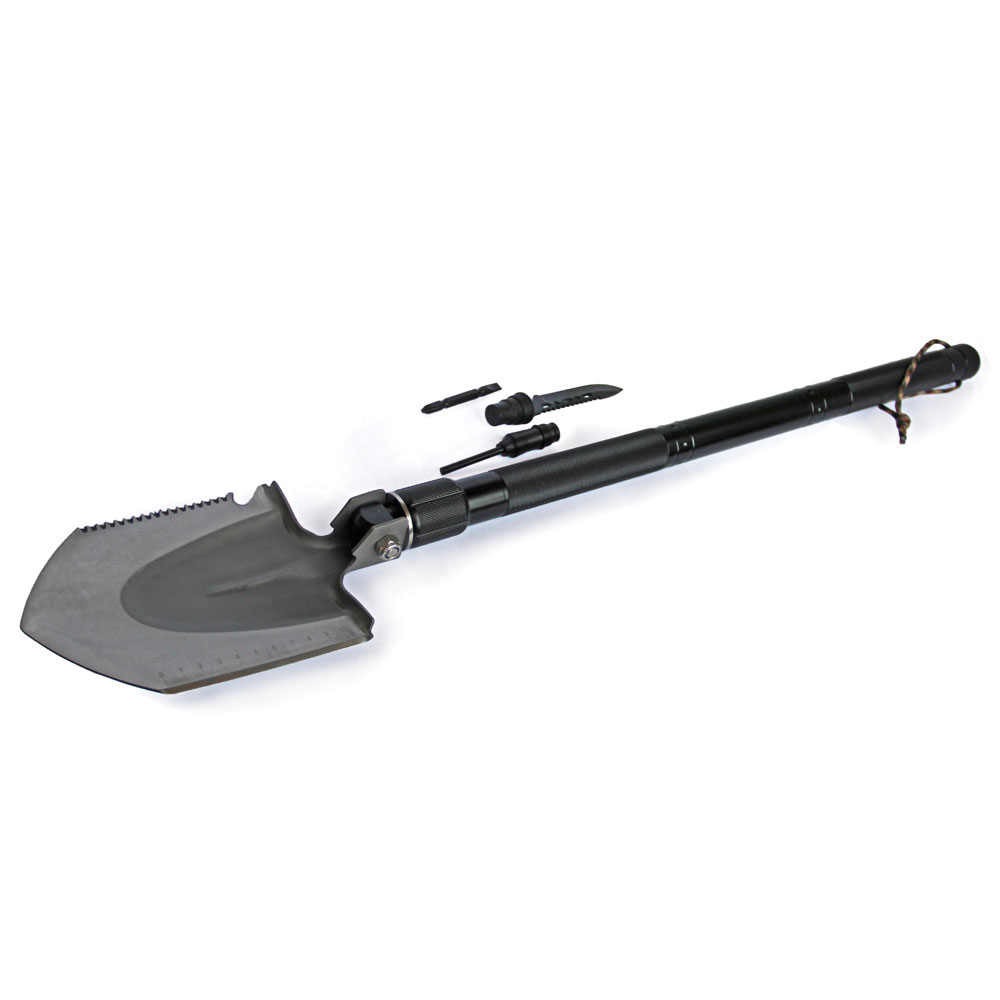 Лопата многофункциональная (топор, пила, кирка, нож) с огнивом благодаря небольшим размерам не займет много места в багажнике автомобиля, кофре квадроцикла, рюкзаке. В лопате есть место для организации набора выживания в герметичной полости внутри рукояти. Нержавеющая, толстая, прочная сталь.