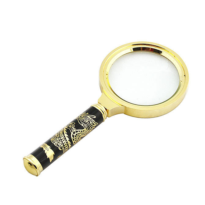 Лупа с четырехкратным увеличением изготовлена из латуни. Линза диаметром 70 мм помещена в плотную оправу, к которой прикреплена рукоять. Характерной особенностью этого изделия можно считать изысканное изображение дракона, украшающее ручку. Данная модель подходит для личного пользования, а также используется в качестве подарка.