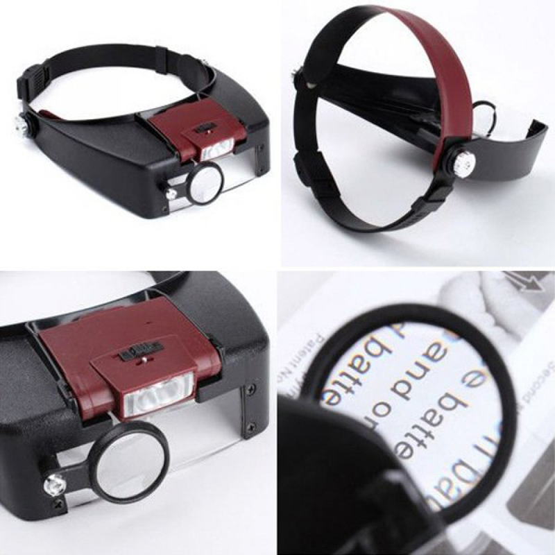 Лупа налобная с регулируемыми стеклами-насадками и удобным фиксатором-обручем на голове. Увеличение: 1.5X, 3.0X, 8.5X, 10.0X. Дополнительная поворотная лупа и откидные линзы дают до 4 шагов увеличения. Светодиодная подсветка (2 суперярких светодиода) позволяет работать в условиях недостаточной освещенности. Подобная налобная лупа незаменима для слабовидящих людей при чтении, работе с мелкими предметами. Лупа позволяет не занимть руки и рассматривать предметы на разной кратности (сменные линзы). Сферы применения такой лупы обширны: чтение, радиотехнические и ювелирные работы, часовые работы, медицина.