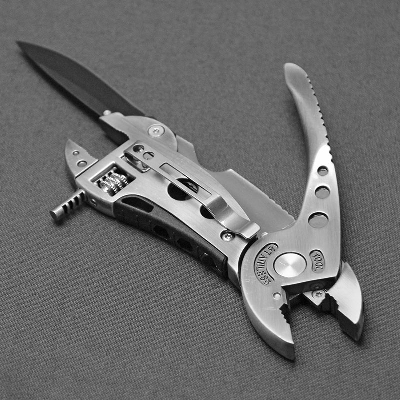 Мультитул-гаечный ключ с набором инструментов. Сменные биты, нож, отвертка, пассатижи, гаечный ключ, чехол. Мультиинструмент с разводным ключом и пассатижами Traveler ― средняя по размеру модель. Интересный дизайн, надежный материал, из которого изготовлена модель, достаточно легкий ― все это делает мультитул отличным решением