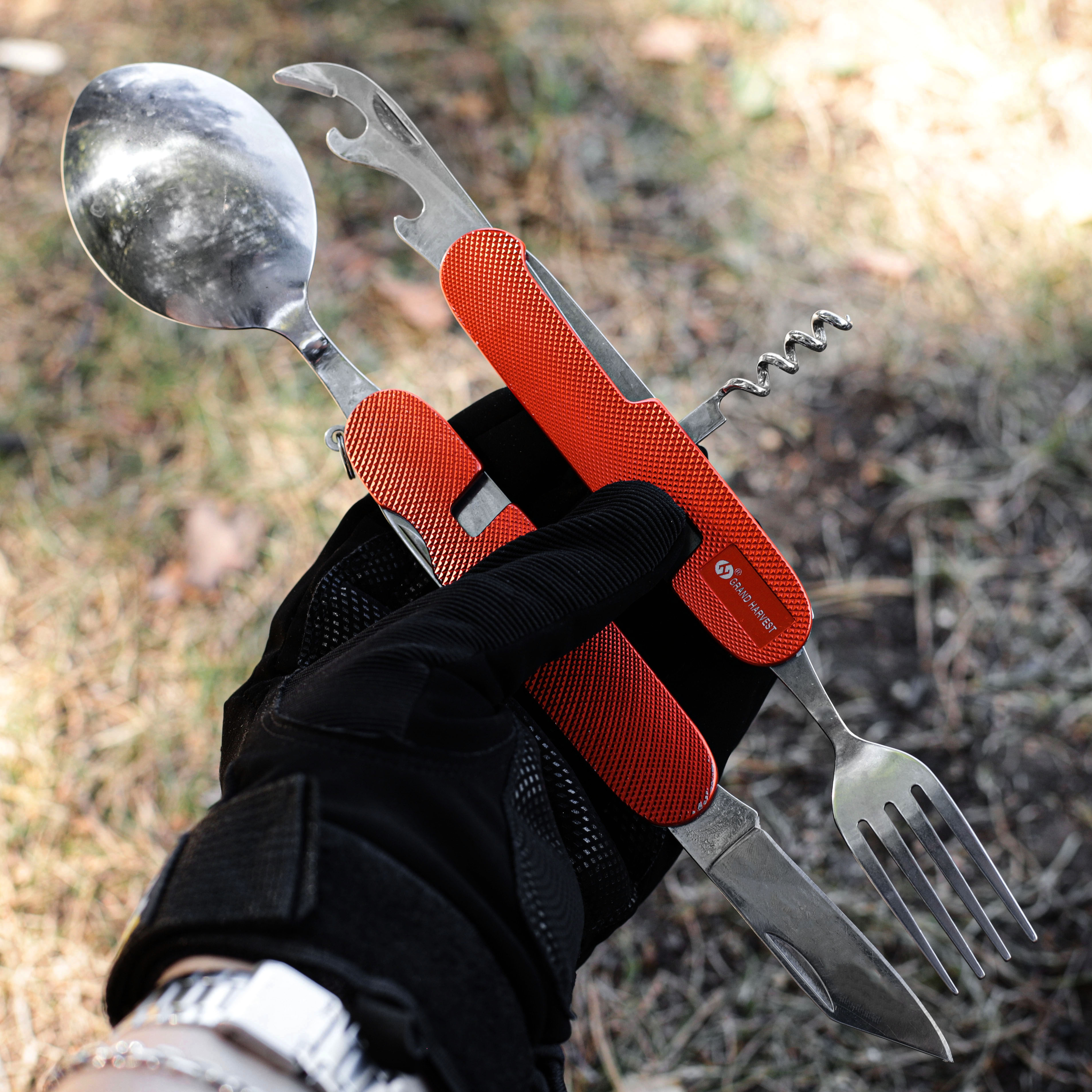 Удобный и компактный складной набор столовых приборов из 6 предметов - ложки, вилки, ножа, штопора, открывалки и консервного ножа. Это поистине удобный набор для путешествий и разного вида туризма, ведь такой практичный и функциональный мультитул сделает любой приём пищи гораздо комфортнее. Набор выполнен из высококачественной нержавеющей стали. Для удобства использования прибор разделяется на 2 части, благодаря чему и становится можно одновременно пользоваться вдвоем. В комплекте идёт чехол.