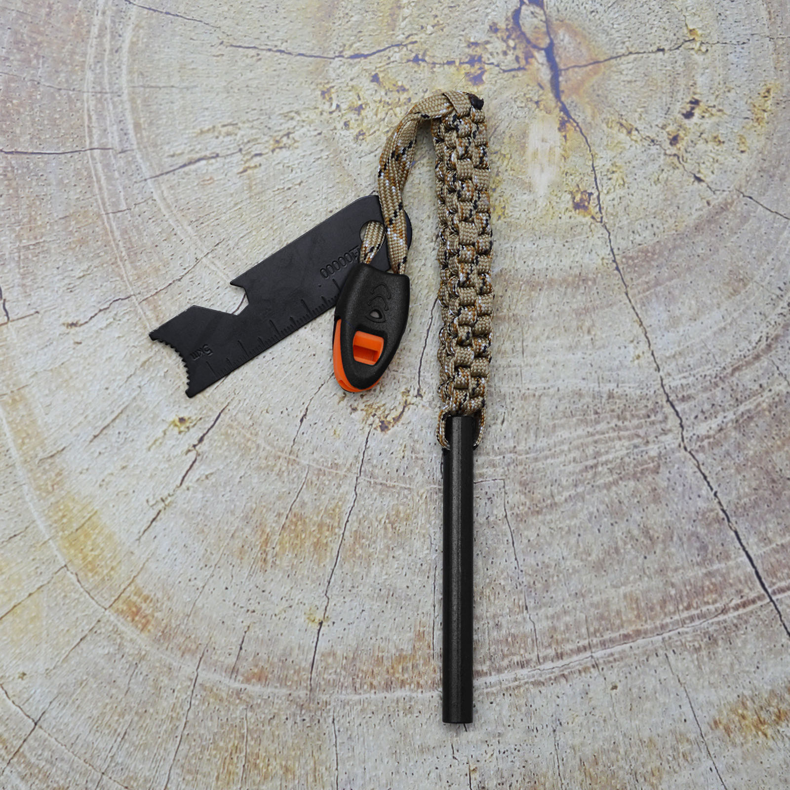 Стержень огнива выполнен из ферроцерия (сплав не менее чем из 7 редкоземельных металлов), в паре с кресалом из нержавеющей стали, обеспечивающее высечение искр, паракордом и свистком.