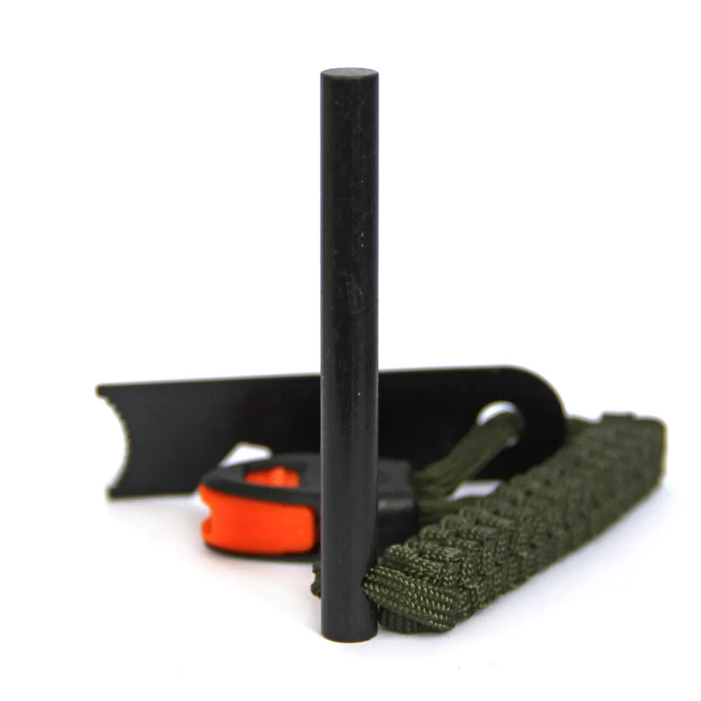 Стержень огнива выполнен из ферроцерия (сплав не менее чем из 7 редкоземельных металлов), в паре с кресалом из нержавеющей стали, обеспечивающее высечение искр, паракордом и свистком.