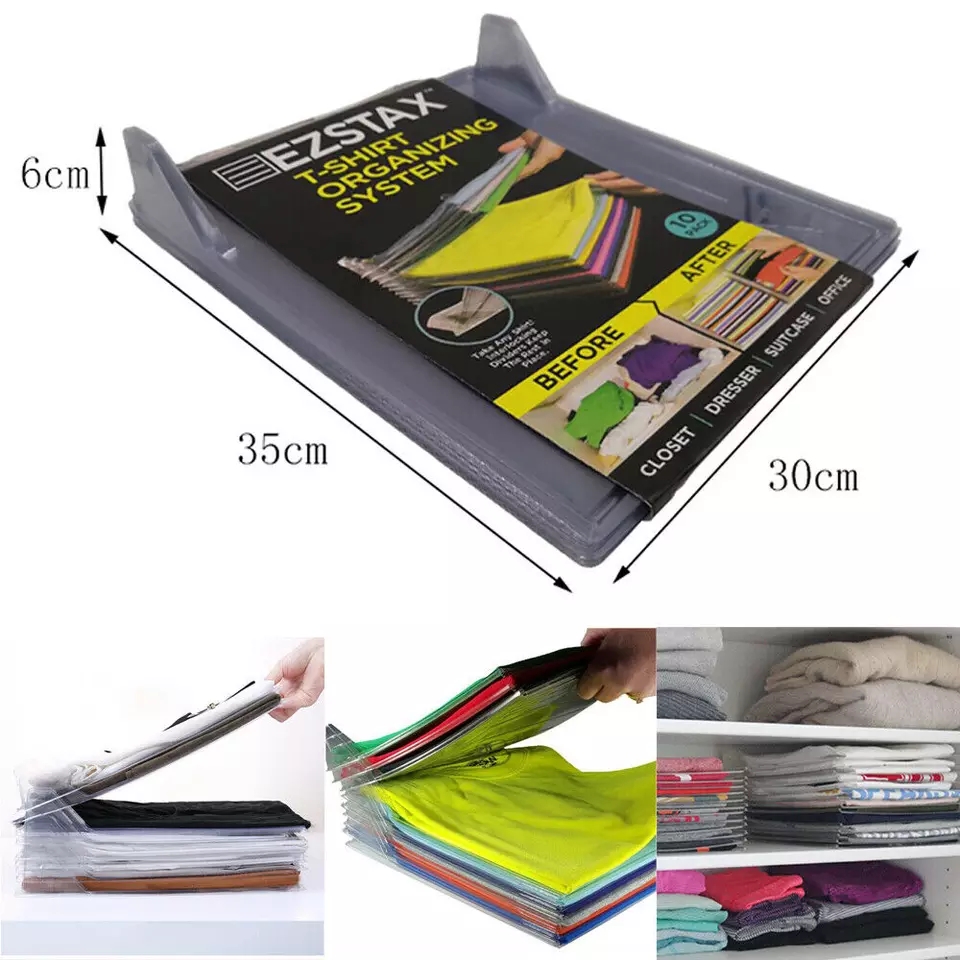 Органайзер для одежды Ezstax - это набор прозрачных гибких пластиковых разделителей-подносов для аккуратного хранения одежды, различных вещей из ткани или бумаги. Ezstax прост в использовании. Положите каждую вещь на поднос Ezstax и поставьте их друг на друга в стопку. Теперь, чтобы достать нужную вещь из стопки, просто поднимите ее верхнюю часть и легко вытащите искомый предмет одежды. Вся остальная стопка останется на месте, а не выпадет вместе с вытащенной футболкой.