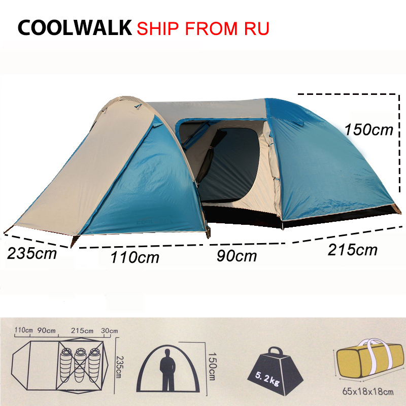 3-4-х местная туристическая палатка увеличенный тамбур габаритные размеры 200см+215см+30см*215см*150см ткань тента с серебристым покрытием Polyester 190T UP 3000мм. внутренняя палатка 100% дышащий Polyester дно палатки из Polyester 190T breath able&Polyester UP 4000мм. дуги выполнены из Fiberglass диаметром 8,5мм вес палатки 5,0кг габариты палатки в сборе 65см*18см*18см палатка с двумя входами все швы проклеены антимоскитные сетки в палатке есть два кармана для мелочи и петля для лампы палатка комплектуется колышками и штормовыми растяжками