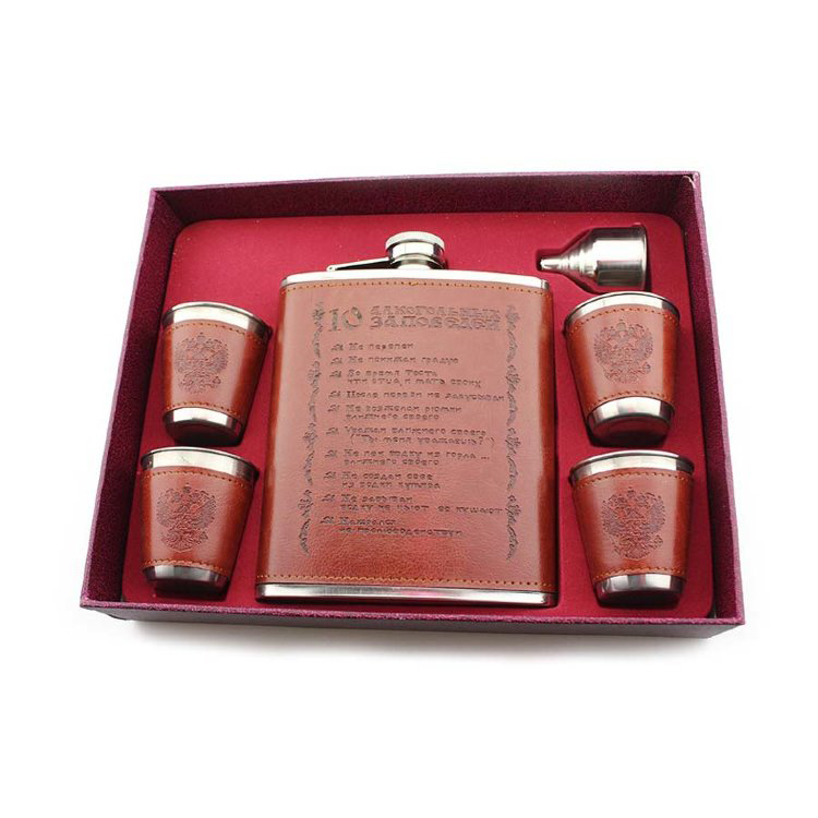 Подарочный набор в красивой коробке. Состоит из фляжки 0,5 л., оклееной кожзамом с надписью "10 алкогольных заповедей", четырёх стопок по 75 мл. и воронки.