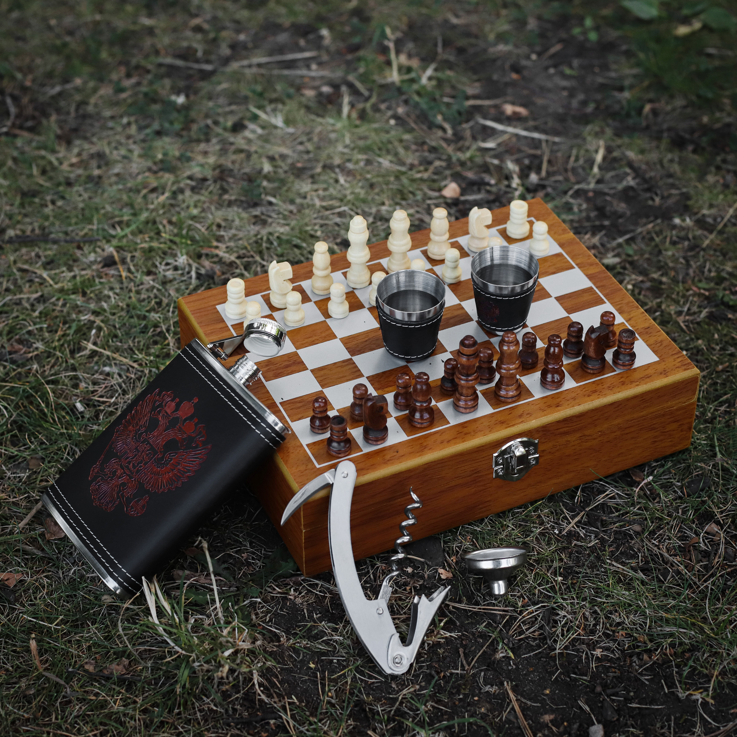 Походные и подарочные шахматы, фляга, 2 стаканчика, воронка и мультитул в чемодане. Фигурки дерево, размер поля 24х18 см.