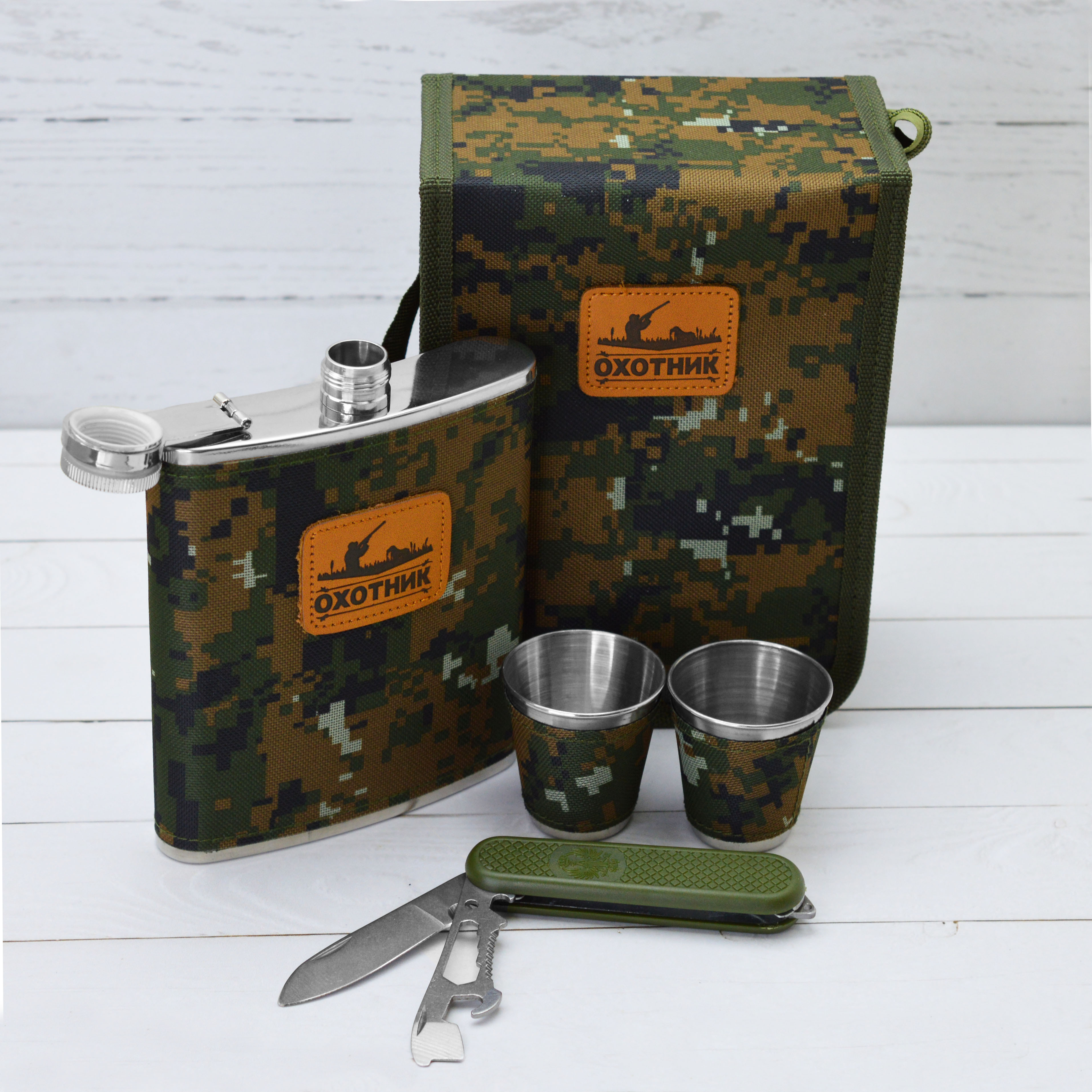 Походный набор "Охотник" в чехле на двоих: фляга 500мл, 2 стаканчика, мультитул (камуфляж)