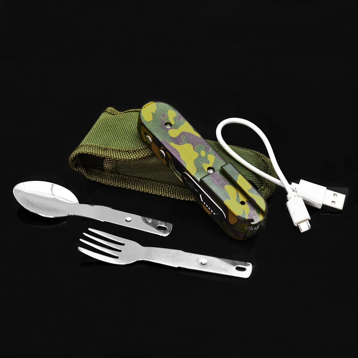 Незаменимый походный набор включающий в себя: вилка ложка беспламенная спиральная USB зажигалка лазер боковой фонарик Набор выполнен из высококачественной нержавеющей стали, упакованный в специальный чехол