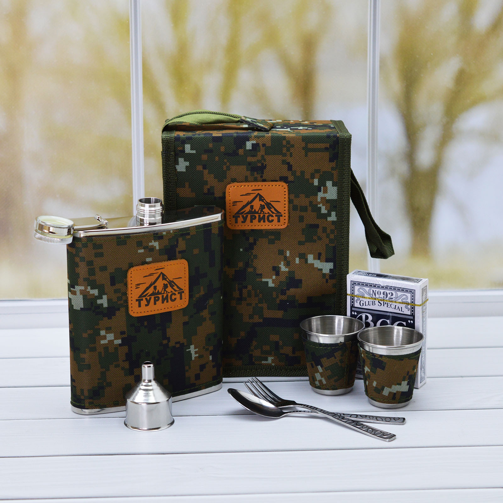 Походный набор в чехле на двоих: фляга 500мл, 2 стаканчика, вилка, ложка, карты"покер" и воронка (милитари)