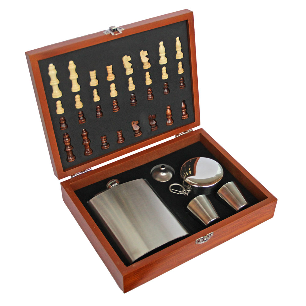 Сувенирные деревянные шахматы, фляга и стаканчики QZ-8D Изумительный подарочный набор для мужчины: коробка и доска с шахматами, и набор для благородных напитков из высококачественной нержавеющей стали.
