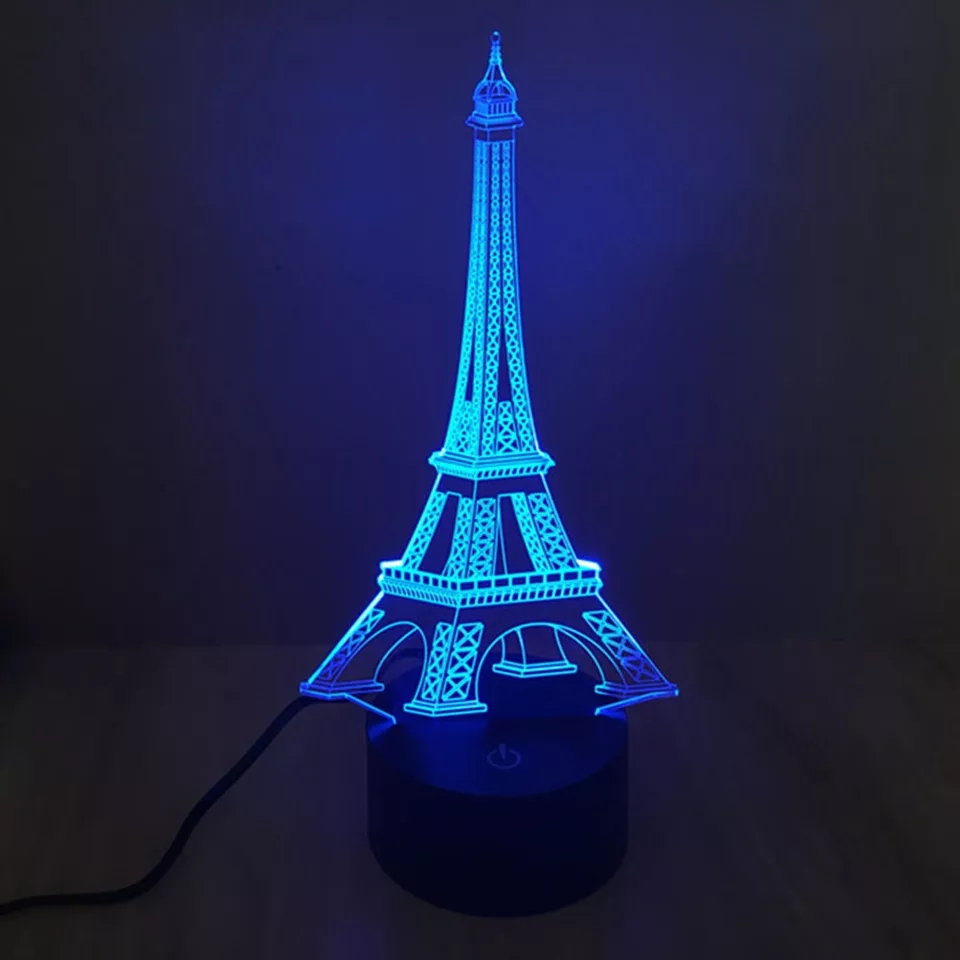 Светильник-ночник 3D «Эйфелева башня» - модный сувенир и полезное приобретение для дома и офиса. За счет специальной конструкции светильника, оригинальная схема линий-световодов создает эффект 3D модели. Рисунок состоит из тонких линий, реализующих объемную фигуру. Рисунок надежно нанесен на прозрачную пластину (акриловая доска), которая вставляется в прорезь несущего основания со светодиодами. Тонкие линии в темноте создают иллюзию объема - 3D. Светильник послужит отличным и запоминающимся подарком сотрудникам, бизнес-партнерам, а также возможность создать уникальный продукт по вашему дизайну!