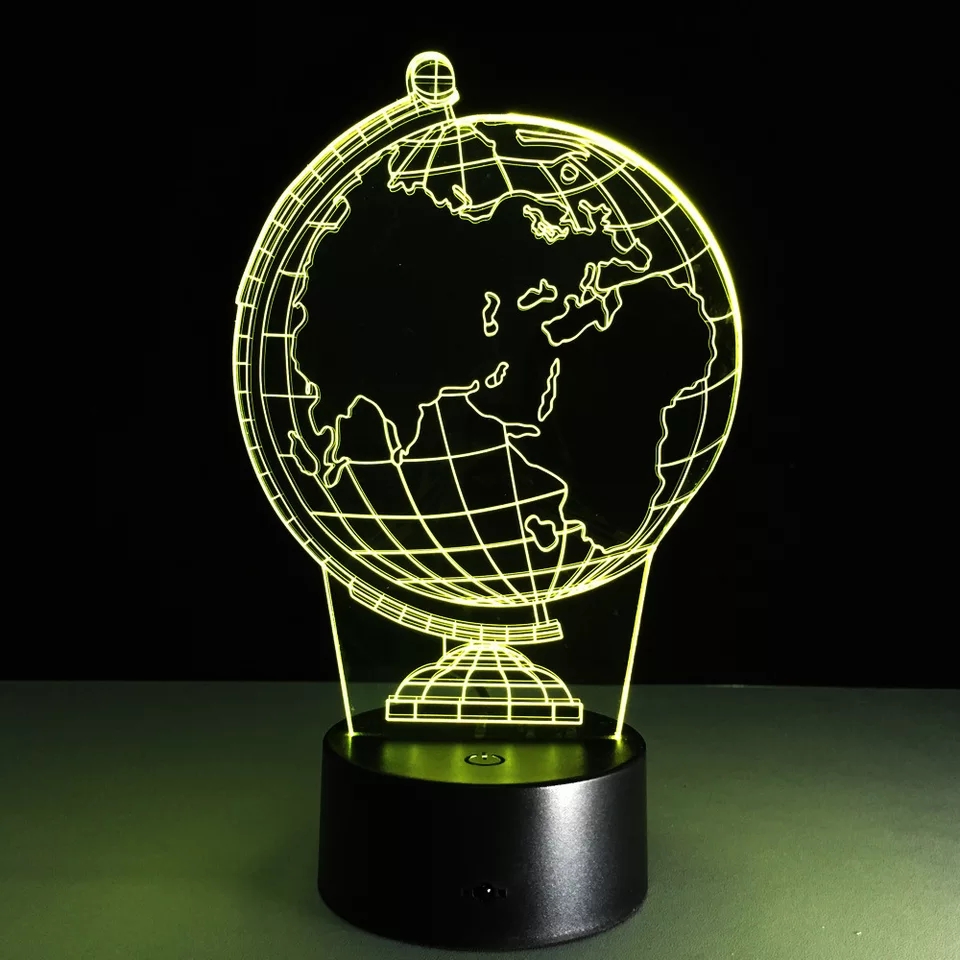 Светильник-ночник 3D «Глобус» - модный сувенир и полезное приобретение для дома и офиса. За счет специальной конструкции светильника, оригинальная схема линий-световодов создает эффект 3D модели. Рисунок состоит из тонких линий, реализующих объемную фигуру. Рисунок надежно нанесен на прозрачную пластину (акриловая доска), которая вставляется в прорезь несущего основания со светодиодами. Тонкие линии в темноте создают иллюзию объема - 3D. Светильник послужит отличным и запоминающимся подарком для путешественников и юных географов.