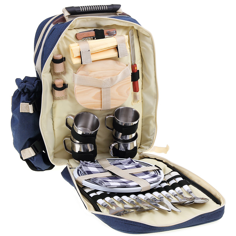 Столовые приборы и чашки изготовлены из нержавеющего металла. Тарелки из твердого стеклопластика. Разделочная доска из дерева. Матерчатые салфетки.