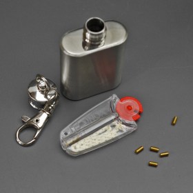 Стальная походная мини-канистра 30мл, прочная и герметичная. Идеальный вариант для транспортировки и хранения бензина для огнив и зажигалок. Также для розжига огня в неблагоприятных условиях. Имеет карабин. Идеальный набор для бензиновых огнив.