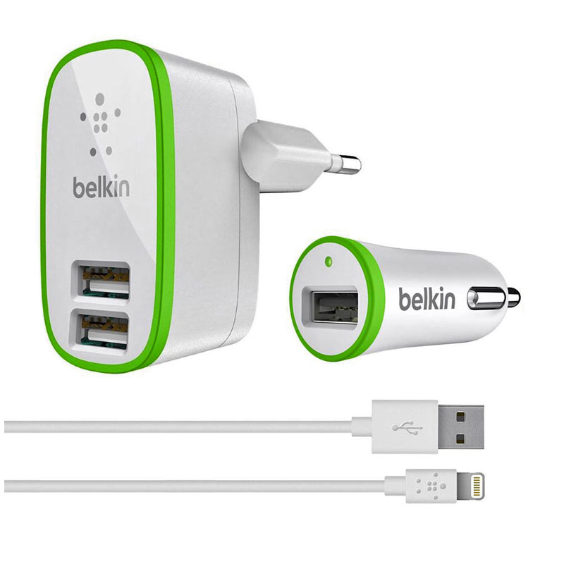 Сетевое и автомобильное зарядное устройство.Belkin Travel charger 2USB 2.1A + Car charger 1USB 2.1A + Lightning cable White - это универсальное ЗУ